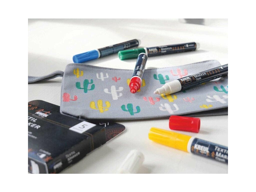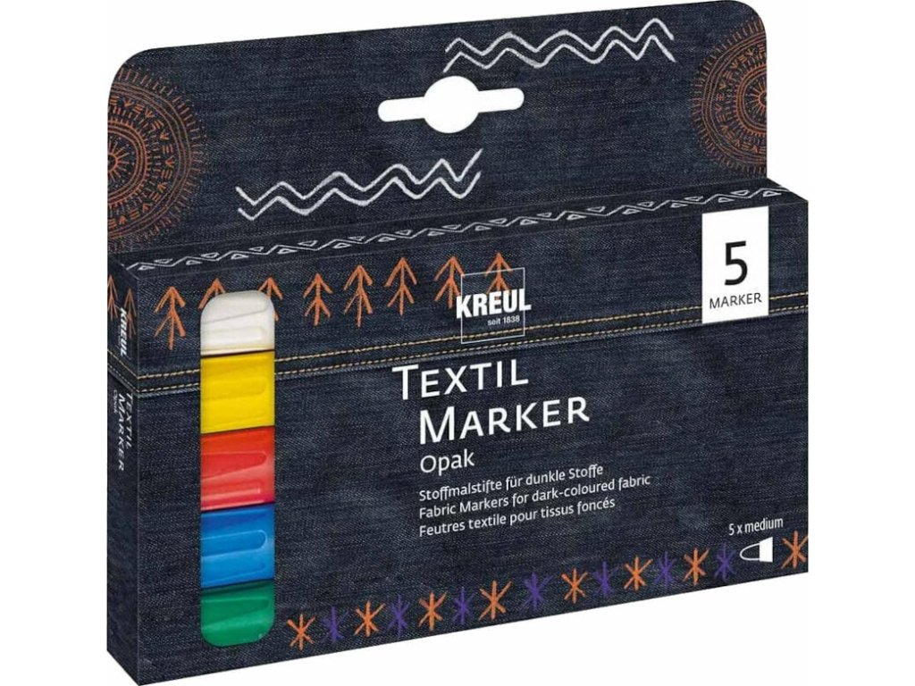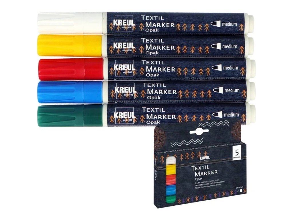 So sadou piatich fixiek na textil vytvoríte nepriehľadné vzory na mnohých látkach. Fixky KREUL Textile Marker Opak sú vhodné na svetlé aj tmavé látky. Farby sú intenzívne a nepriehľadné. Okrúhly hrot popisovača na textil zaisťuje presné kreslenie línií aj na hrubšie textílie. Jednoducho, bez škvŕn tam, kde ich nanesiete.